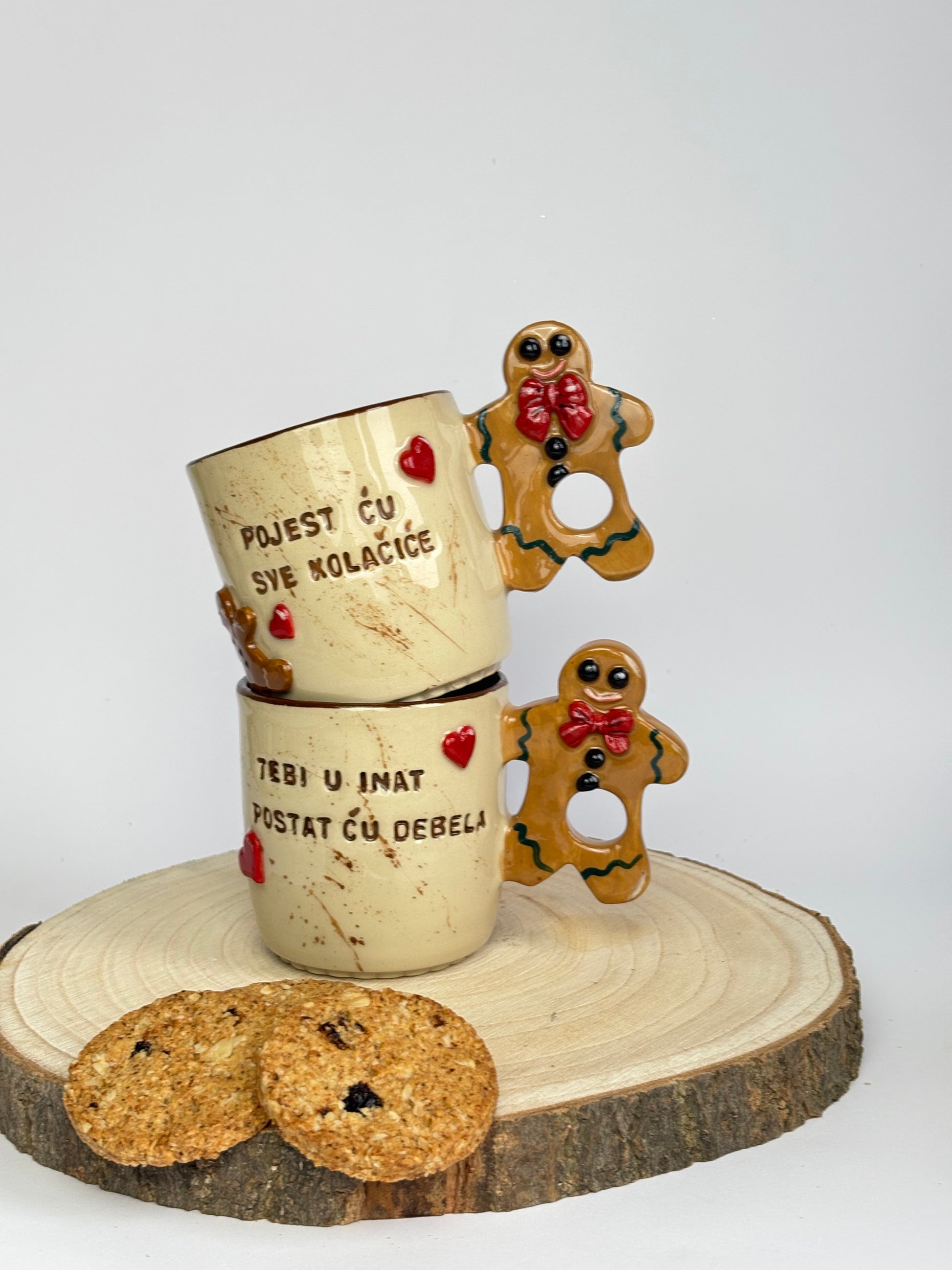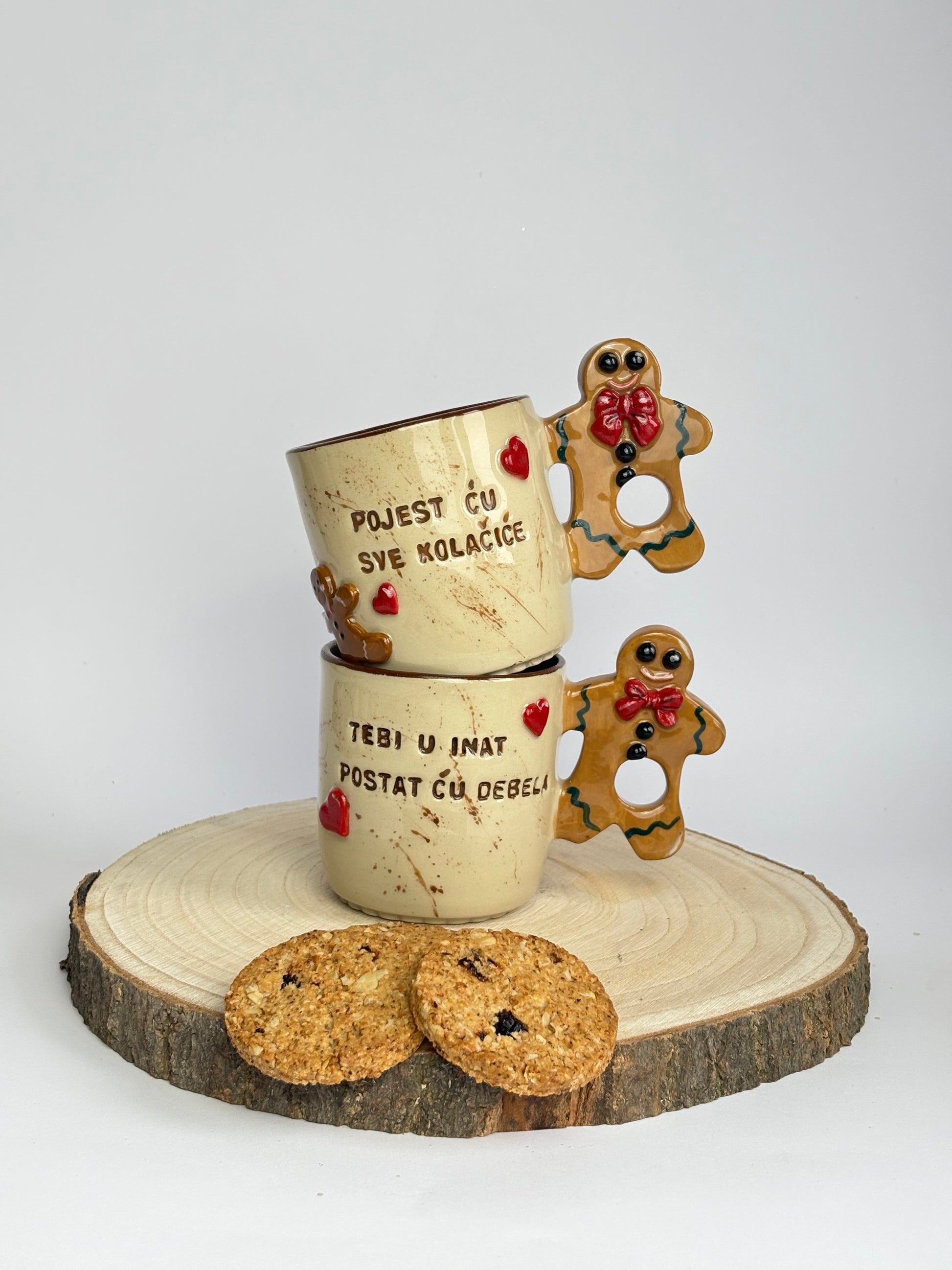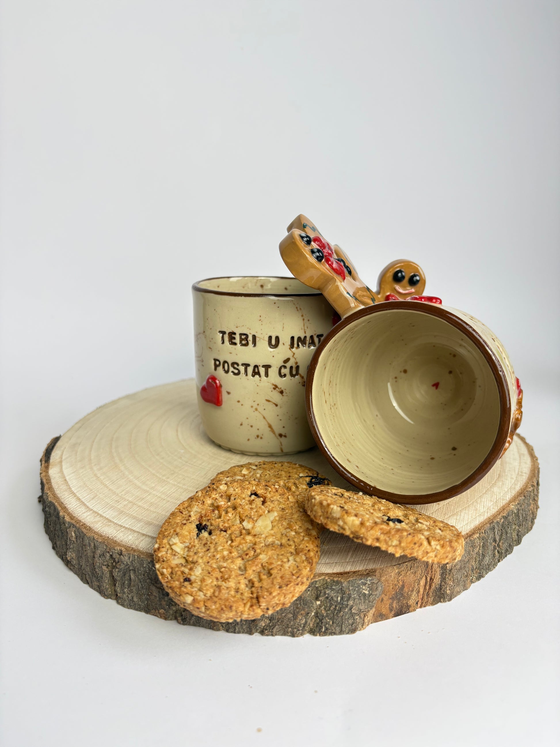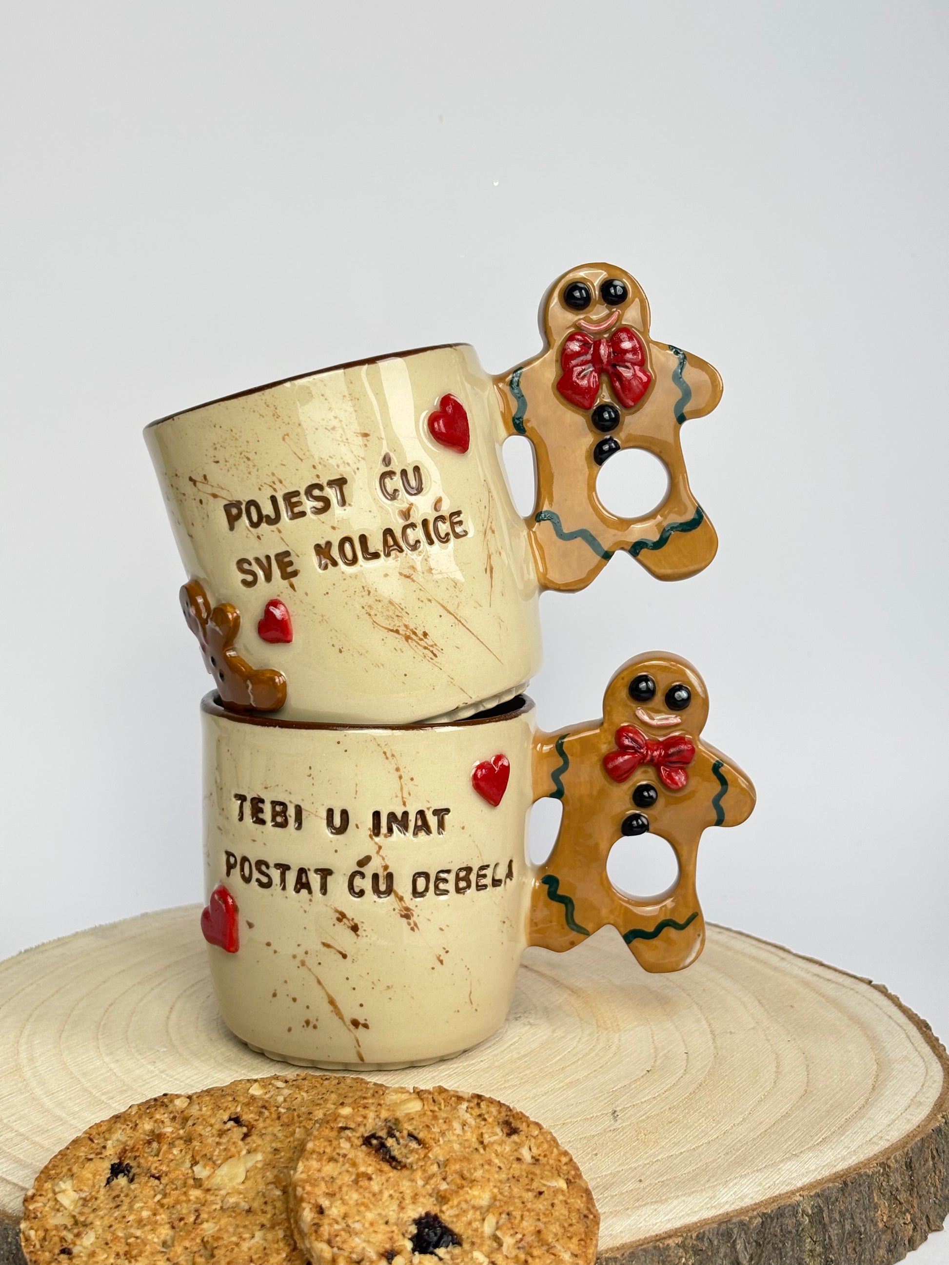 Ručno rađena keramička šalica s ručkom u obliku kolačića.