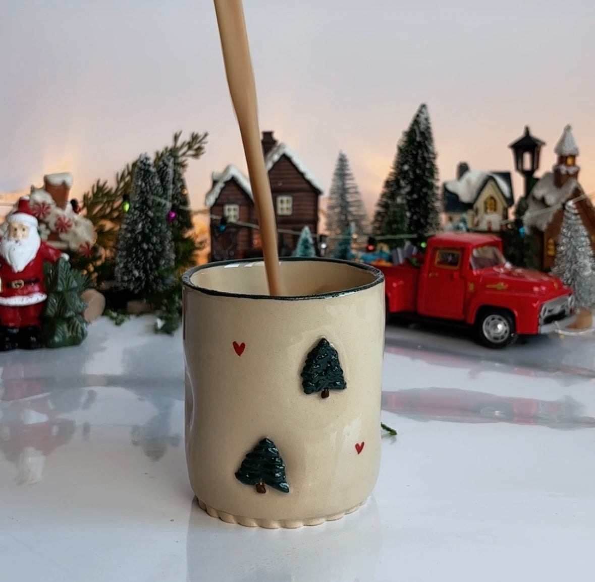 Ručno rađena keramička šalica bez ručke s utisnutim borovima