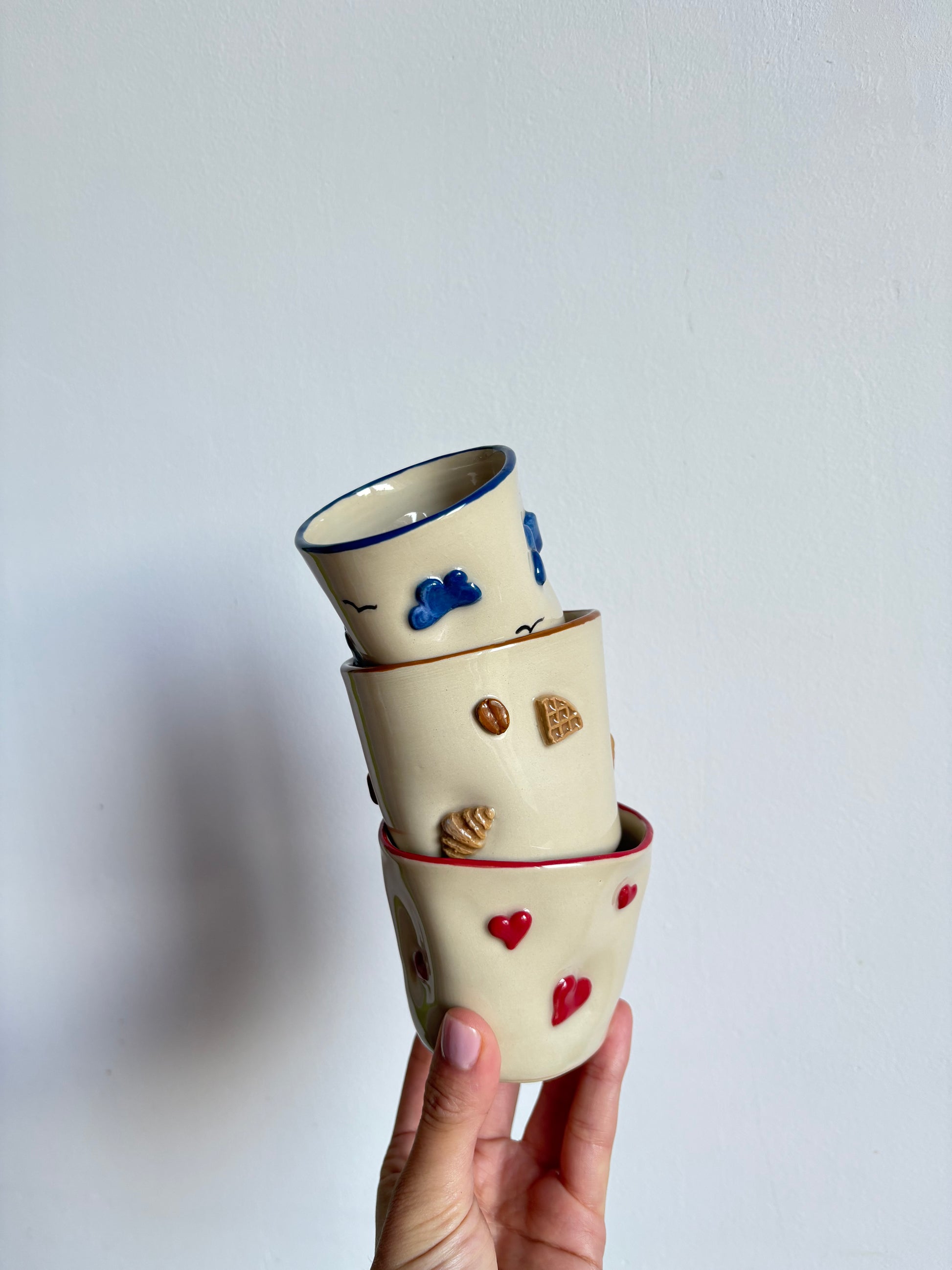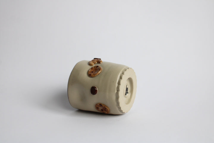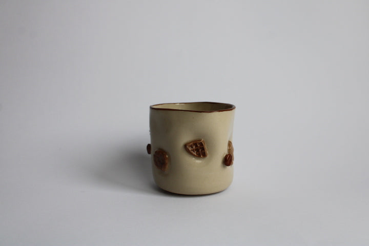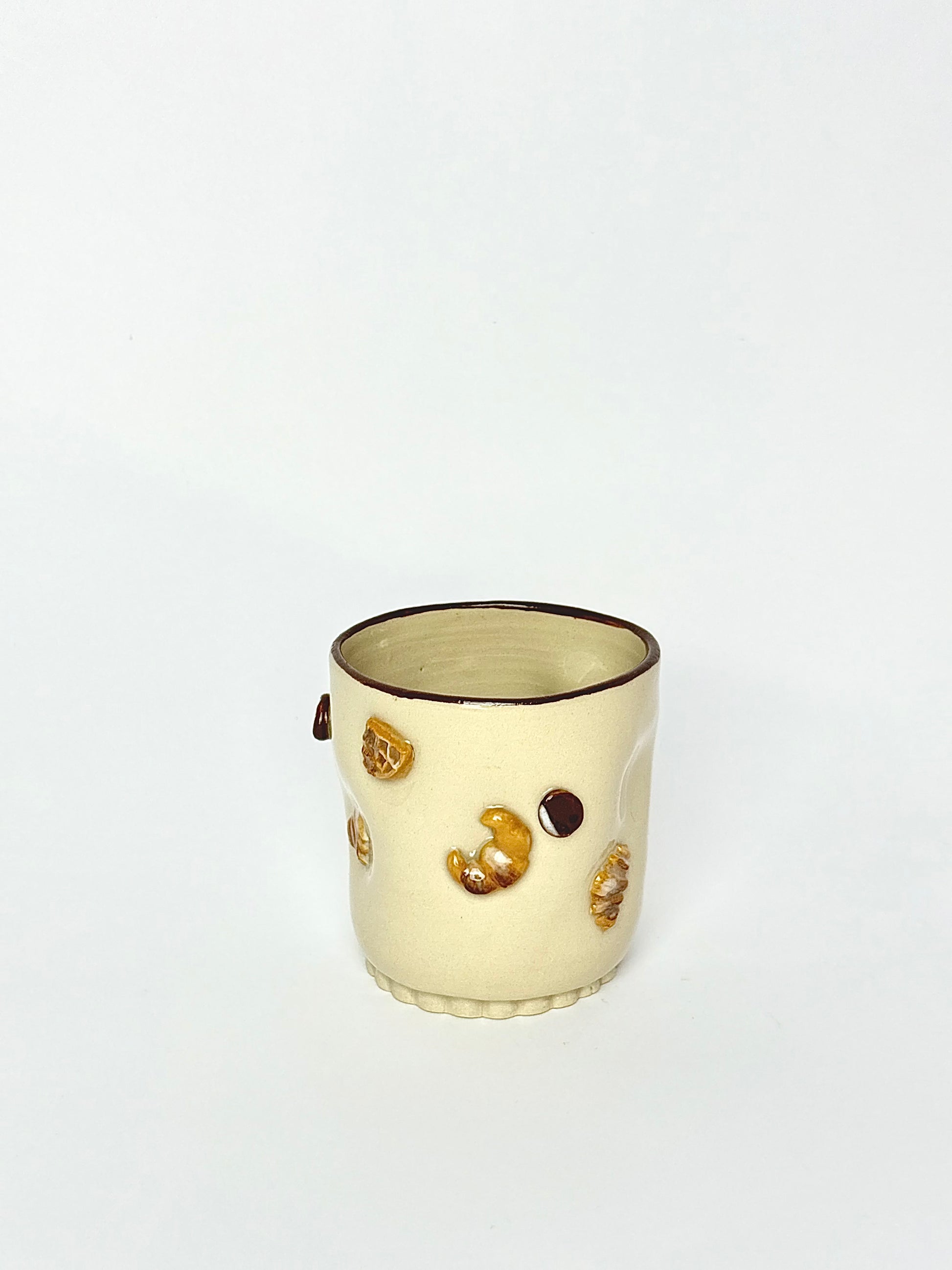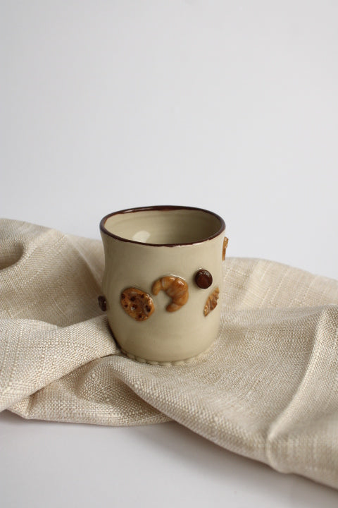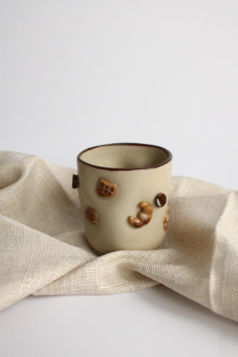 Ručno rađena keramička šalica s utisnutim pekarskim proizvodima bez ručke.