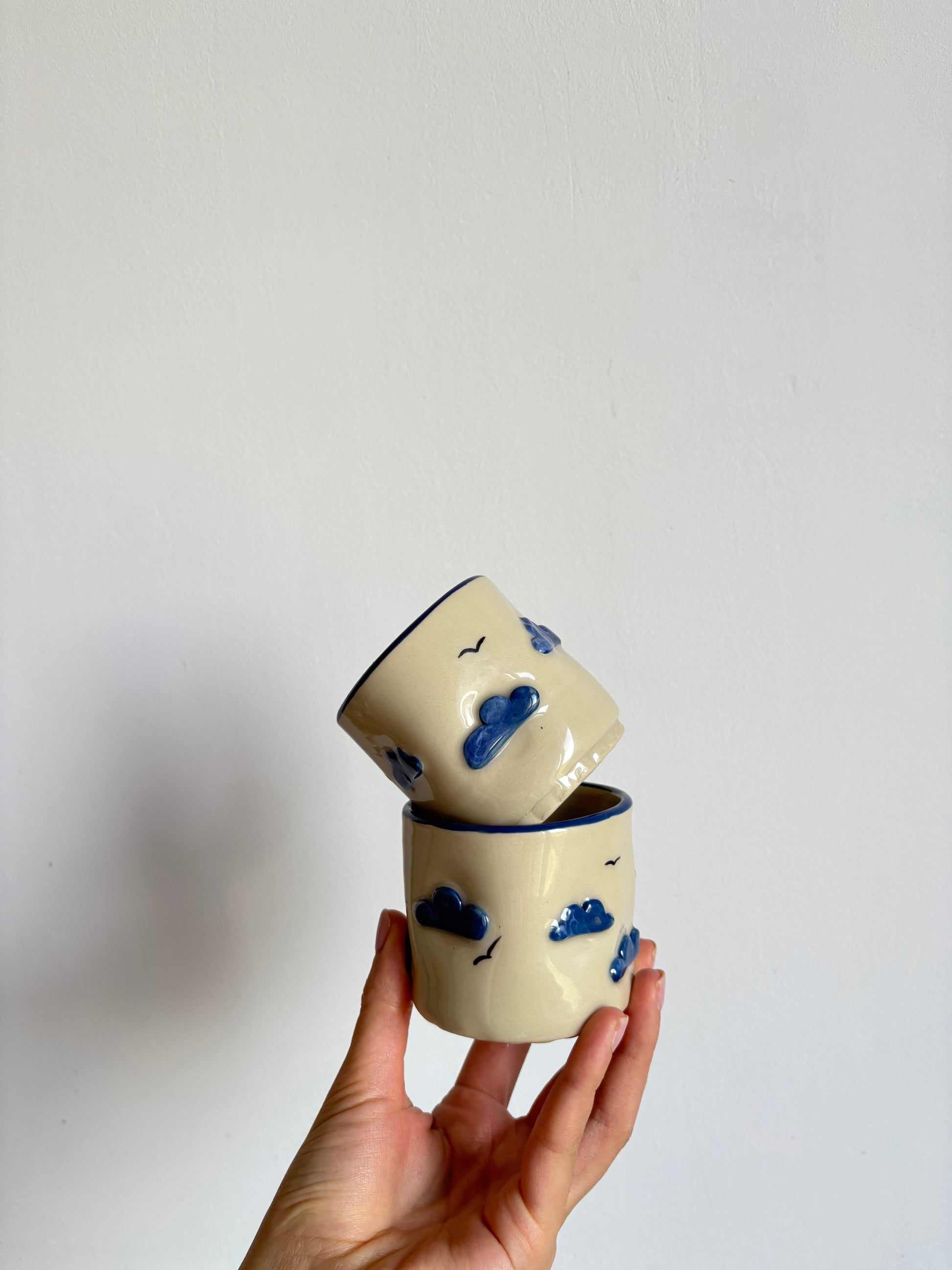 Ručno rađena keramička šalica bez ručke s utisnutim oblacima